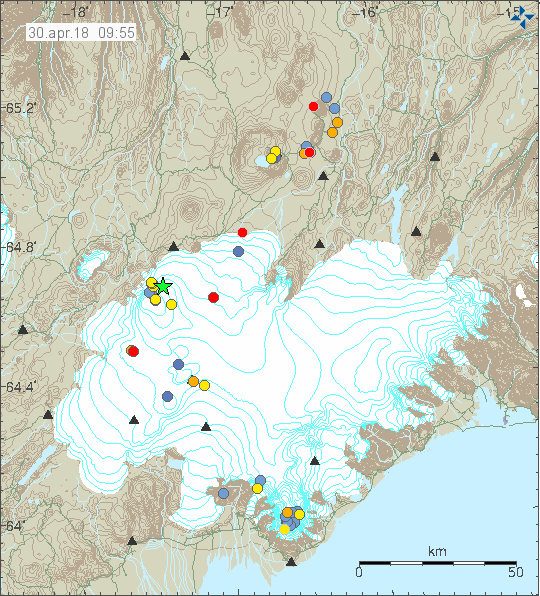 According to the Seismic Monitoring System of the the Icelandic Meteorological Office the epicenter of the 3.9 magnitude quake was 5.9 km (3.7 mi) Northeast of the center of the volcano's caldera at a significant depth of 3.3 km (2 mi).
